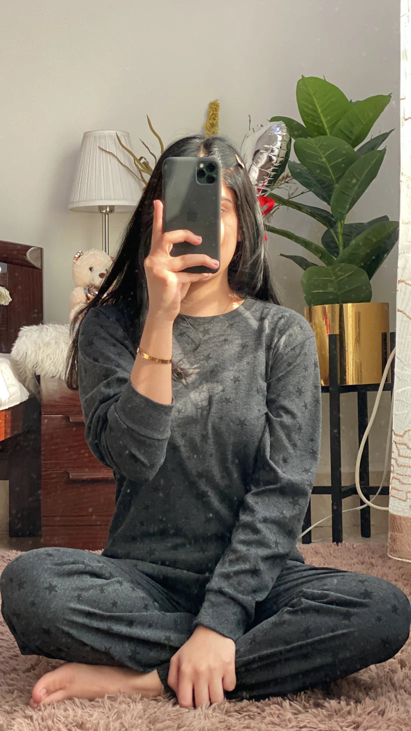 Featuring a stylish charcoal color with cute star prints, this set includes a full-sleeve top and matching pajama bottoms, ideal for sleep or lounging at home.